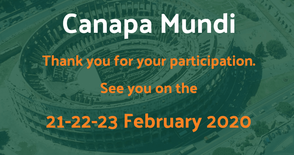 CanapaMundi – Rom 2020 ist die größte Veranstaltung in Italien mit exponentiellem Wachstum, die einzige, die offiziell als international anerkannt wurde. 2018: 9.000 m², 150 Stände, ein entsprechender Besucheranstieg wird erwartet. Diese Messe ist die Erfolgsgarantie für Aussteller.